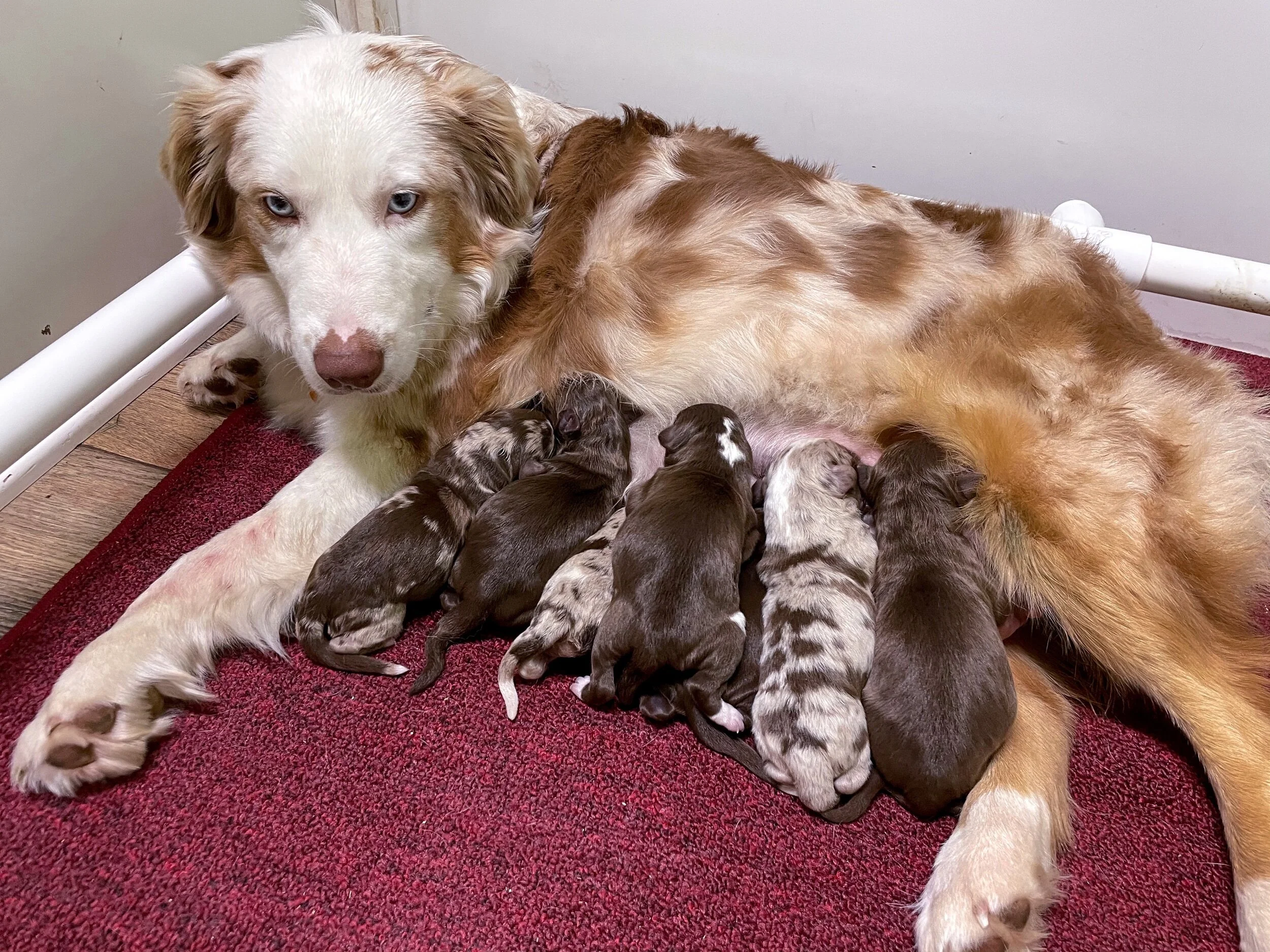 Our sweet Annie girl had her babies. She started labor 2nd stage labor at 8am, had her first puppy at 9am and finished off around 2:45! It was an exciting and exhausting day. Everyone is doing great and resting well.